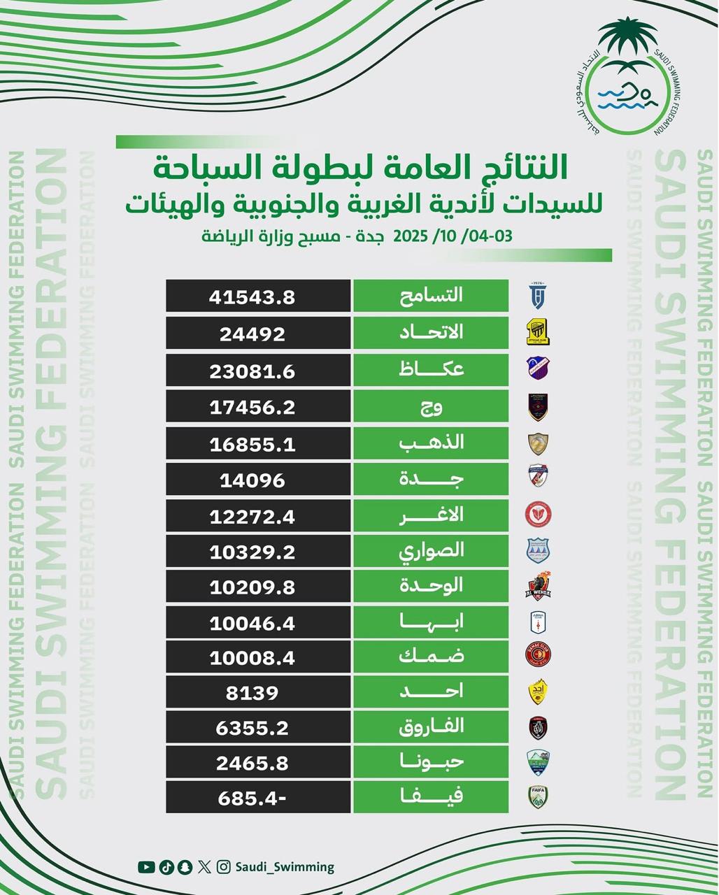 حقق نادي جدة المركز السادس في بطولة السباحة للسيدات لأندية الغربية والجنوبية والهيئات، في إنجاز يعكس تطور مستوى الرياضة النسائية في النادي وحرصه على دعم المواهب الواعدة. وجاءت نتائج البطلات على النحو التالي: لمى تامر عمران (فئة 13-14 سنة):